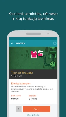 Šiuolaikiniame pasaulyje, kur informacijos srautai niekada nesustoja, gebėjimas mąstyti aštriai, greitai įsiminti ir efektyviai susikoncentruoti tampa ne prabanga, o būtinybe. „Lumosity" gimė iš troškimo padėti kiekvienam atrakinti savo smegenų potencialą, siūlydama mokslu pagrįstą ir įtraukiantį kelią į geresnes kognityvines funkcijas. Kviečiame leistis į nuotykių kupiną kelionę, kurios tikslas – tobulinti protinius gebėjimus per smagius ir stimuliuojančius iššūkius.