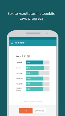 „Lumosity" lavina atmintį, dėmesį ir kitus kognityvinius įgūdžius. Daugiau nei 70 milijonų žmonių visame pasaulyje naudoja per 25 žaidimus, kurie prisitaiko prie jūsų lygio. Mėgaukitės įdomiomis ir naudingomis užduotimis, skirtomis jūsų smegenims.