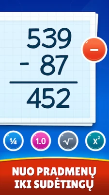 Atraskite naują būdą pamilti skaičius su „Matematikos žaidimas" – patrauklia ir visiškai nemokama mokymosi platforma, kurioje nėra jokių skelbimų. Ši unikali programėlė kviečia į smagų ir interaktyvų pasaulį, kuriame įvairios matematinės užduotys, loginiai galvosūkiai ir mįslės laukia jūsų sprendimų. Tobulinkite savo sudėties, atimties, daugybos ir dalybos įgūdžius arba drąsiai imkitės sudėtingesnių iššūkių, tokių kaip trupmenos, dešimtainiai skaičiai ir mišrūs veiksmai. „Matematikos žaidimas" paverčia mokymąsi įspūdžiu, prieinamu visai šeimai!