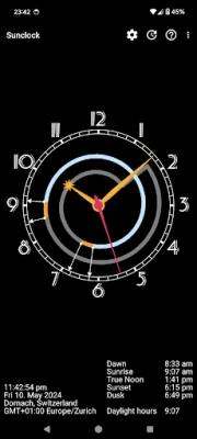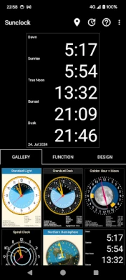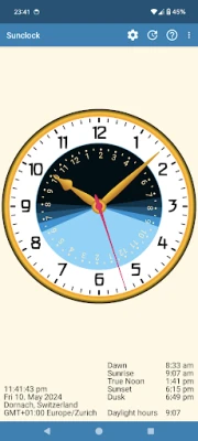 „Sunclock" – tai astronominis laikrodis, kuris ne tik rodo civilinį laiką, bet ir atvaizduoja saulėtekio, saulėlydžio bei įvairių prieblandos fazių laikus. Gaukite tikslų, gamtos diktuojamos dienos eigos vaizdą tiesiai savo įrenginyje.